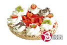 Traditionele zachte vlaaibodem gevuld met banketbakkersroom. Afgewerkt met gebakken boterkruimels. Opgemaakt met rozetten van verse slagroom.